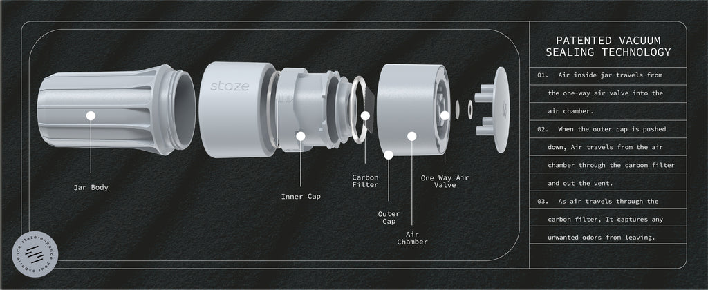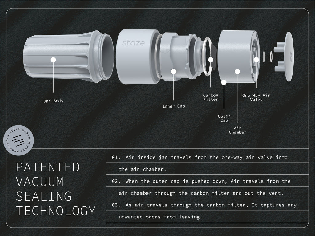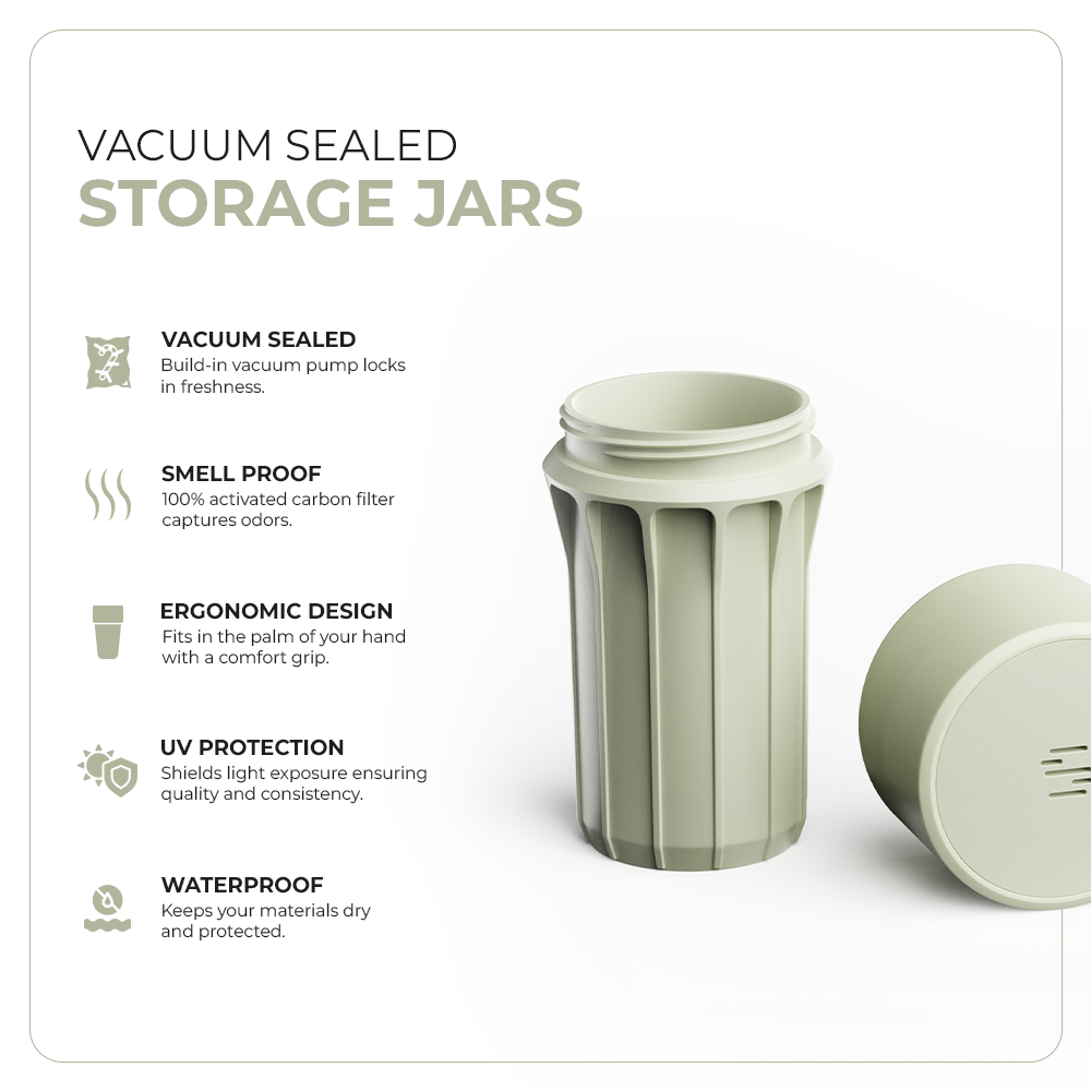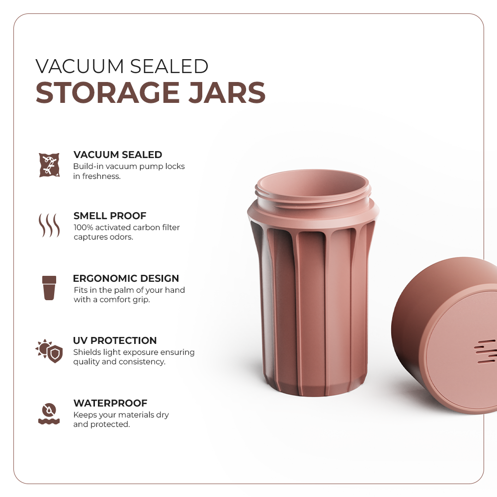 Each jar features our patented vacuum-seal technology, locking out air and locking in freshness with a simple twist. Smell-proof, waterproof, UV protected, and ultra-durable—these jars are built for wherever life takes you.