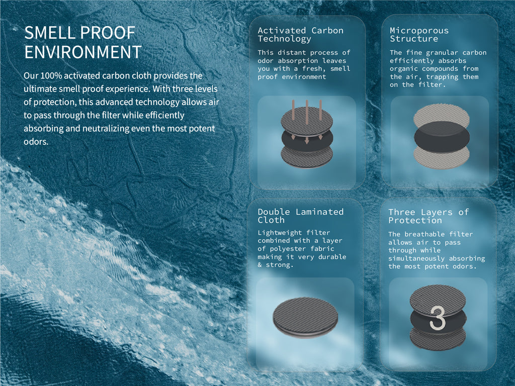 The jar features a unique, 100% activated carbon filter built into the cap. This breathable fabric allows air to pass through while actively absorbing and trapping odors, making it fully smell-proof.